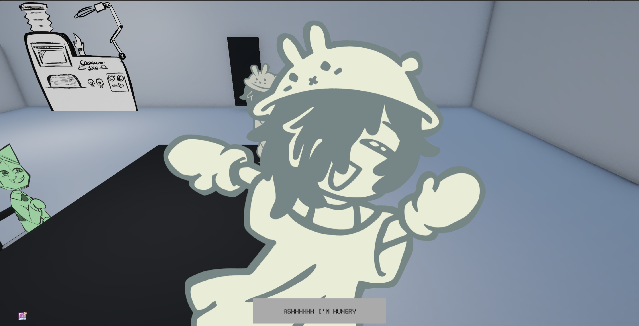 Ash cooks for her imaginary friends, tossing ingredients into a machine and serving whatever comes out. It’s a simple, cozy loop of cooking, giving, and spending time with the people only she can see.